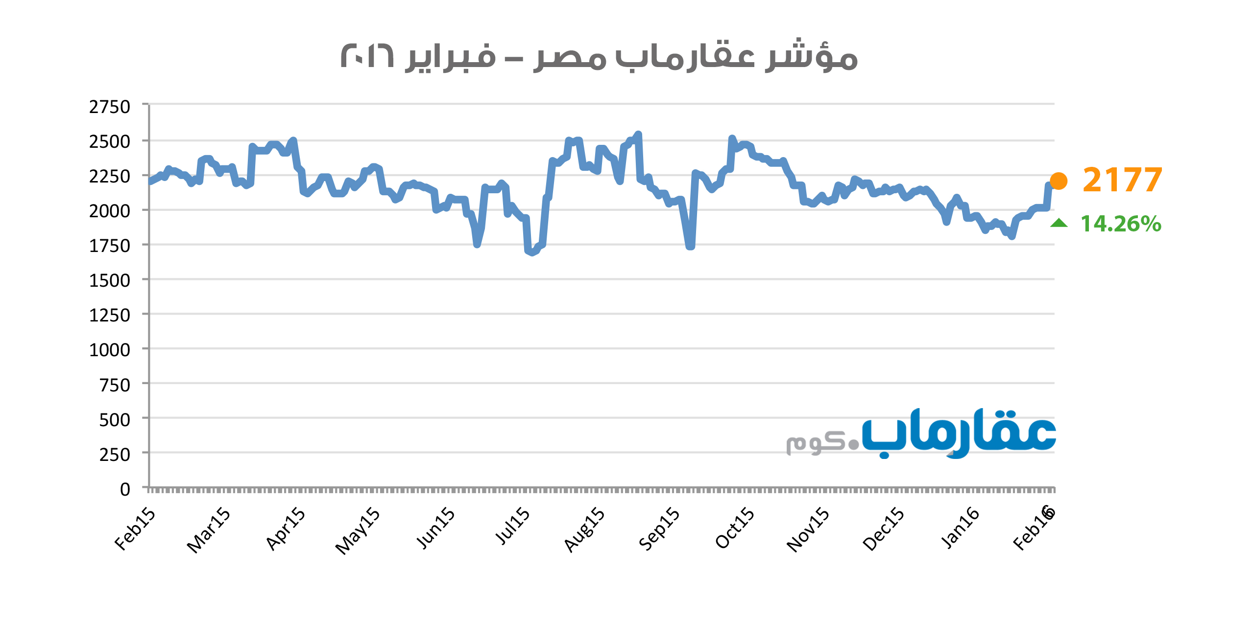 قفز مؤشر عقارماب مصر خلال آخر أسبوع من شهر فبراير ليحقق نمو بنسبة ١٤٪ بالمقارنة مع شهر فبراير، حيث كانت القيمة النهائية للمؤشر في شهر فبراير ٢١٧٧ نقطة. ويعد هذا النمو الكبير بمثابة تعديل وتصحيح للتراجع الكبير الذي تم خلال الثلاثة الأشهر الماضية بالتزامن مع موسم الشتاء الذي عادة ما يشهد هدوء وتراجع في الطلب. ويمكننا أن نعتبر أن نمو الطلب في آخر أسبوع من شهر فبراير إشارة إلى بدأ موسم المبيعات لعام ٢٠١٦، حيث عادة ما يبدأ الطلب بالنمو خلال موسم الربيع ويبلغ ذروته في موسم الصيف.