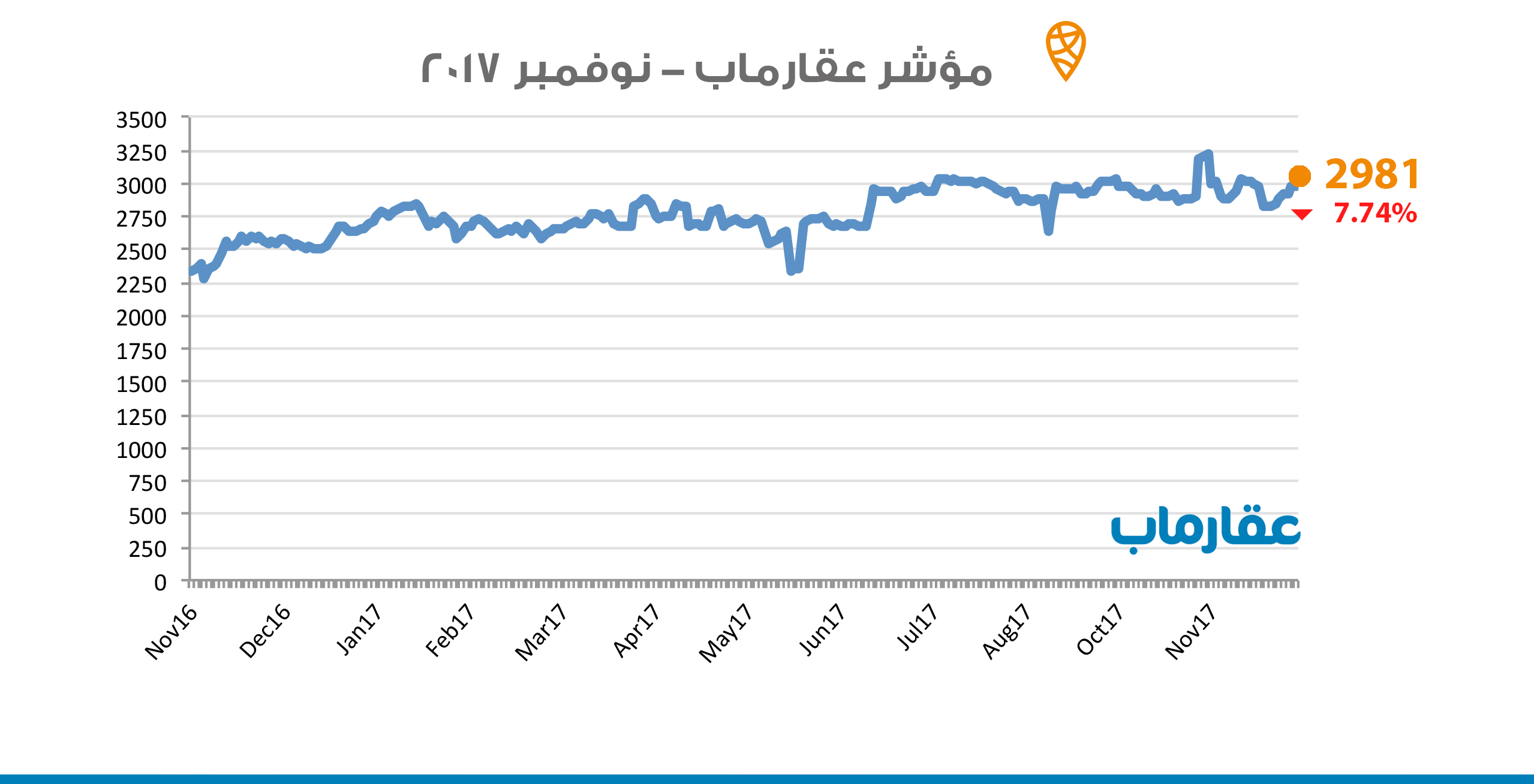 بعد زيادة متسارعة في حجم الطلب خلال الشهرين السابقين، سجل مؤشر عقارماب مصر تراجع في مستوى الطلب بنسبة ٧٪ لتصل قيمة المؤشر عند نهاية شهر نوفمبر إلى قيمة ٢٩٨١ نقطة، ويبدو أن هذا التراجع كان بمثابة تصحيح للصعود المفاجئ للطلب خلال الفترة السابقة. ولكن يبقى وضع السوق العقاري على مستوى عالي من النشاط خصوصاً مع استمرار شركات التطوير العقاري في إطلاق المشاريع الجديدة.